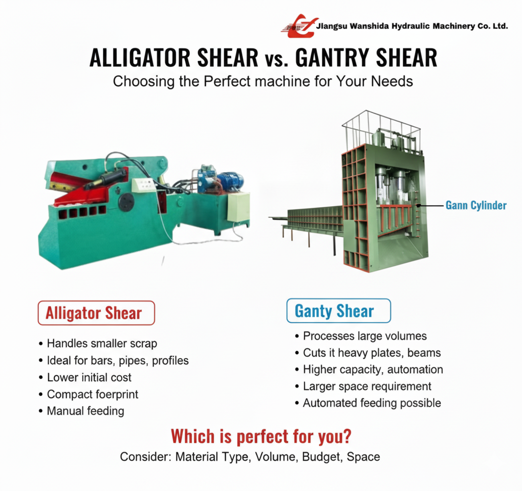 The Q43L-8000L Gantry Shear is a super heavy-duty hydraulic scrap shearing machine specially designed for cutting large-size and thick metal materials such as car bodies, steel beams, heavy plates, and industrial scrap.With an 8000 kN cutting force (800 tons) and a 2000 mm blade length, this Industrial Shear Machine provides powerful shearing capacity, fast working cycle, and reliable performance under continuous operation.Its horizontal feeding structure and PLC automatic control system make operation easy, safe, and efficient — ideal for large recycling yards, steel mills, ship-breaking sites, and foundries handling heavy scrap. 2. Application Cutting car body, H-beam, steel plate, round bar, and mixed scrap Processing heavy melting steel for smelting Large scrap yards and dismantling centers Steel plants and metal recycling industries 3. Technical Specifications Parameter Specification Model Q43L-8000L Cutting Force (kN) 8000 Loading Room Size (mm) 8000 × 1950 × 900 Blade Leng…