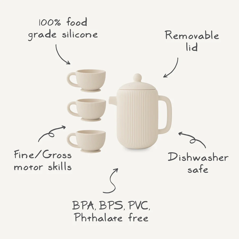 Ribbed Silicone Tea Pot Set | BPA-Free Educational Play Tea Party Set & Kitchen Bath Play Pretend Toy Modern, textured role-play essentials for little hosts Product Overview This ribbed-textured silicone tea set toy is a stylish, functional play tea set and educational toy for toddlers and young kids. As a complete tea party set and childrens tea set, it includes 1 ribbed teapot and 3 matching teapot cups, ideal for hosting pretend tea parties and doubling as a kitchen pretend toy for immersive role-play. Crafted from BPA-free food-grade silicone, these silicone educational toy are shatterproof, gentle on tiny hands, and easy to clean. This tea set toys bundle fosters social skills, fine motor development, and imaginative play, making it a perfect addition to any kitchen toys collection. Key Features Unique Ribbed Texture: The mint green ribbed design offers a modern, tactile aesthetic that stands out in playrooms Safe Silicone Build: All silicone toys are BPA-free, food-grad…