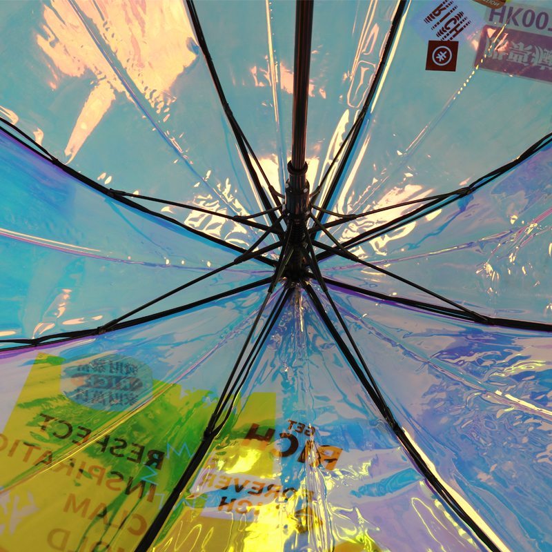 Designed for exceptional durability, this 23-inch rainbow laser straight umbrellas combines dynamic color-shifting aesthetics with a robust 8-rib structure. Compared to standard 8-rib umbrellas, it offers expanded coverage and significantly enhanced wind resistance. A reliable choice for daily use that prioritizes both quality and practicality. This bright umbrellas with J handle not only will take you a great mood, also can protect you from sun and rain an wind. The patterns can be designed as your expected, become a modern fashion umbrellas and fashionable brand umbrellas. 1. Specification Open Size 23”x8 Panels Open Diameter Approx. 103cm/40.55” Cover TPU Frame Material Black Iron shaft, fiberglass ribs Handle J shape plastic handle Approx. Weight Approx.595g Closed Length 83cm/33.67inch 2. The Key Features 8-Rib Reinforced Structure for Superior Protection & StabilityThe number of ribs is a key indicator of an umbrella's sturdiness…