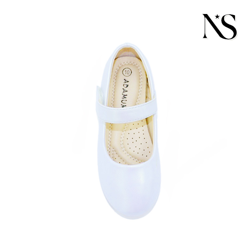 These are a pair of delightful white Mary Jane shoes, perfectly crafted for children. Starting with their appearance, they feature a classic round - toe design. This design not only gives the shoes an adorable look but also ensures that kids' toes have sufficient space to move freely. The upper is made of a smooth, leather - like material, which gives the shoes a refined and elegant appearance. A single strap with a hook - and - loop fastener crosses the instep. This strap not only makes the shoes fit snugly on the feet but is also easy for children to put on and take off by themselves. The sole is a warm brown color, likely made of a durable and flexible material that provides good traction and support for growing feet. In terms of functionality, the interior of the shoes has breathable perforations. These perforations can help keep feet dry and comfortable, especially when kids are engaged in active play. The brand name "ADAMUNU" is clearly visible on the insole, indicating…