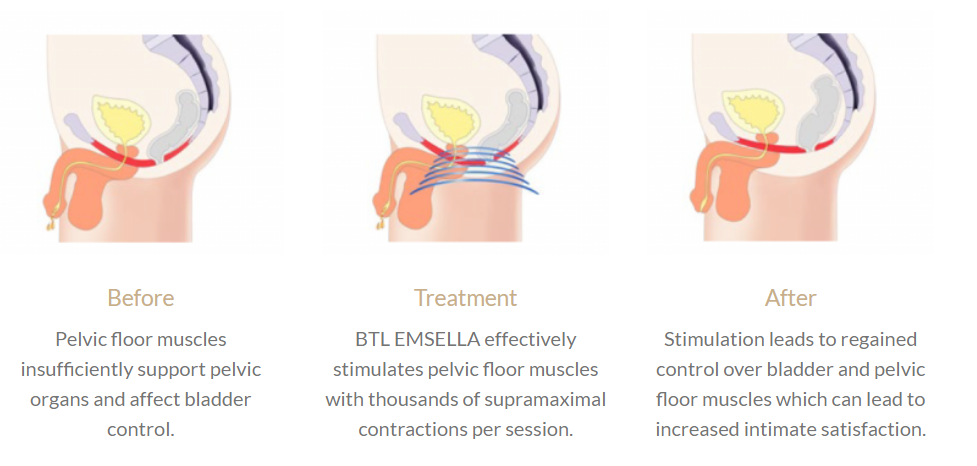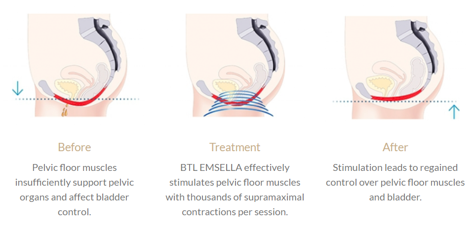 EMSELLA is a breakthrough pelvic floor physiotherapy treatment that greatly improves the quality of life for those with serious urinary incontinence. How Emsella Chair works? The pelvic floor muscles support the pelvic floor organs and control continence. However, natural body aging, childbirth and menopause can cause this group of muscles to decondition resulting in continence problems such as leaking urine when coughing or sneezing. The EMSELLA treatment uses High Intensity Focused ElectroMagnetic Energy (HIFEM) to stimulate and strengthen all the pelvic floor muscles, not just the subset that can be exercised with voluntary contractions (Kegel exercises). These stronger pelvic floor muscles restore continence and the confidence to enjoy normal daily activities without fear of losing bladder control. During each 28-minute session you sit comfortably on the Emsella chair while it generates thousands of supramaximal pelvic floor muscle contractions. Each session…