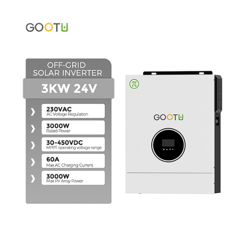 GOOTU Competitive Price 5.5KW Off Grid Solar Inverter With MPPT Controller Solar Energy Pure Sine Wave Inverter Main Features: * 5500W Pure sine wave Output * Built-in Max 80A AC Charger * Built-in 100A MPPT solar charge controller * PV range 120VDC~450VDC * Max PV Voltage 500V * Inverter can work without battery * USB/RS232/WIFI monitor function * Surges to 2X continuous power for 5 seconds for motor loads * Overload and short circuit protection * Selectable charging current based on applications * Configurable AC/Solar input priority via LCD setting * Compatible to mains voltage or generator power * Smart battery charger design for optimized battery performance * Selectable input voltage(90V~280V) range for home appliances and personal computers Data Sheet Models JSK-O4855E100P AC mode…