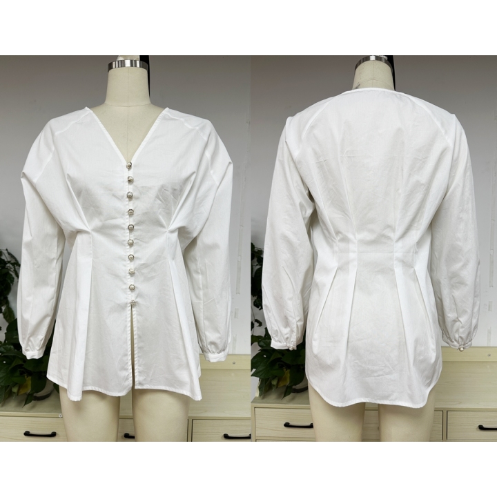 Elegant White Long Sleeve Blouse with Pearl Buttons
