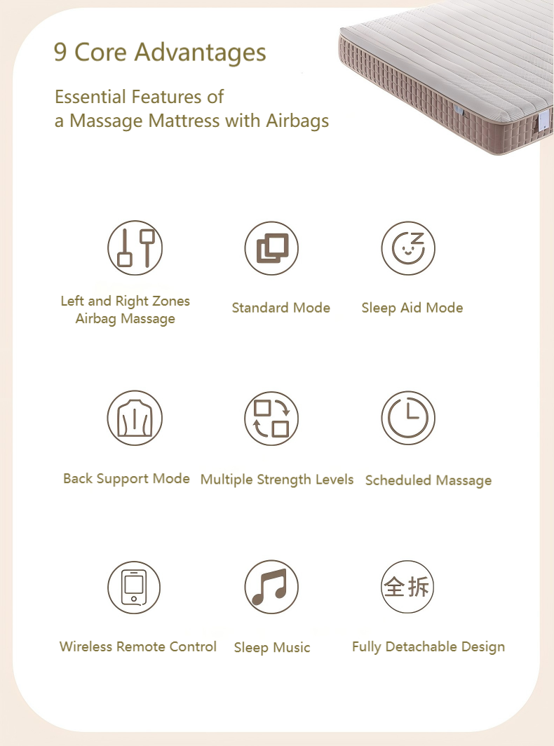Intelligent Mattress Improve Sleep Quality: SereneHaven Smart Massage Mattress Product Overview Finding a mattress that does more than just "support your body" feels like a tall order – until you meet the SereneHaven Smart Massage Mattress. This isn’t just another smart mattress or high end mattress; it’s a game-changer that blends cutting-edge tech with premium comfort, designed to turn every night’s sleep into a truly restorative experience. We built it for modern households (and global B2B partners) who want more from their bedding – think personalized relaxation, spinal support that actually works, and zero compromise on hygiene or durability. Unlike basic Foam Mattress options, this intelligent electric mattress adapts to your body, your preferences, and even your sleep partner’s needs – making it a standout in our SereneHaven bed mattress lineup. Product Images Want to see the details that make this mattress unique? Check out the precision-placed airbags, breathable fabric, and…