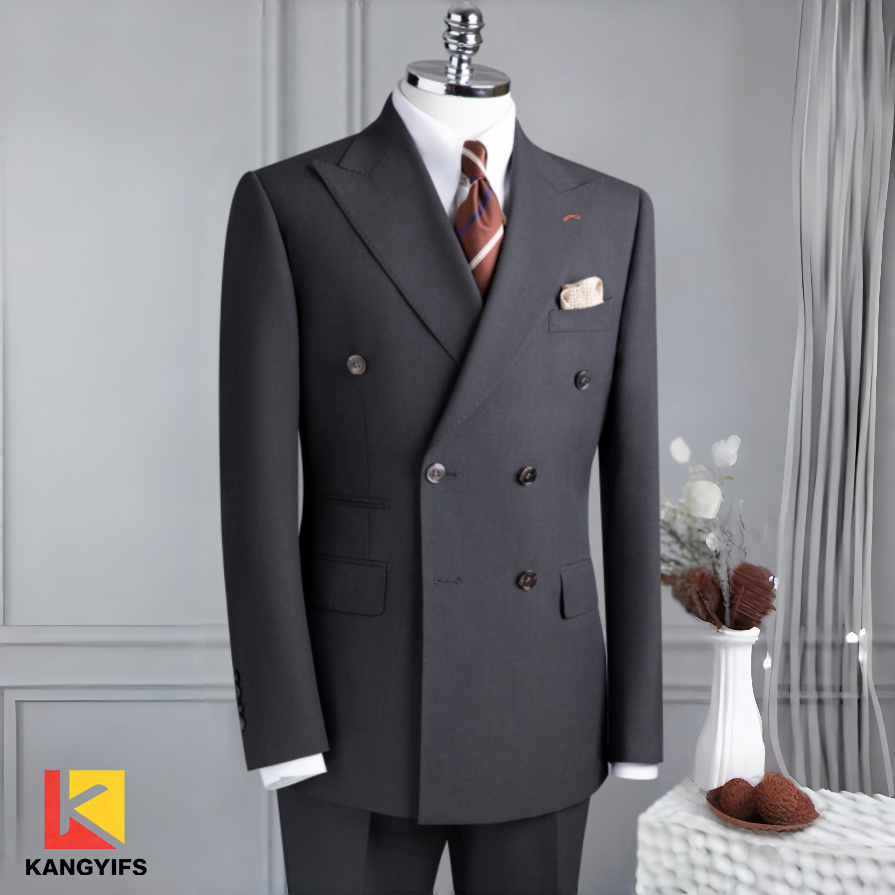 Dark grey is the dual representative of "classicism and presence" in dinner attire - this KANGYIFS double-breasted suit, with its six-button wide lapel design, redefines the sense of ceremony in black bow tie occasions. The silhouette features a slightly cinched waist design. The double-breasted cross-cut naturally accentuates the waistline. The wide lapel extends the shoulder and neck lines, allowing even those with a more rounded figure to achieve a tall and straight silhouette. The fabric is made of matte fine-spun wool, which has a seasonal touch and a strong drape. Under the light, it exudes a low-key texture and luster, neither being overly flamboyant nor standing out in the atmosphere of a dinner party. The details are full of ingenious ideas: The four decorative buttons on the cuffs enhance the refinement, and the chest pocket is paired with a beige jacquard pocket square to balance the stability of the deep grey. Paired with a brownish-red striped tie, it infuses a touch of…