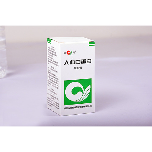 Human albumin is indicated for 1. Shock caused by blood loss, trauma and burn. 2. Increased intracranial pressure caused by cerebral edema and injury. 3. Edema or ascites caused by hepatic cirrhosis and nephrosis. 4. Prevention and treatment of hypoproteinemia. 5. Hyperbilirubinemia in new born babies. Supplementary treatment of cardiopulmonary shunt, fire burn and hemodialysis; treatment of adult respiratory distress syndrome.