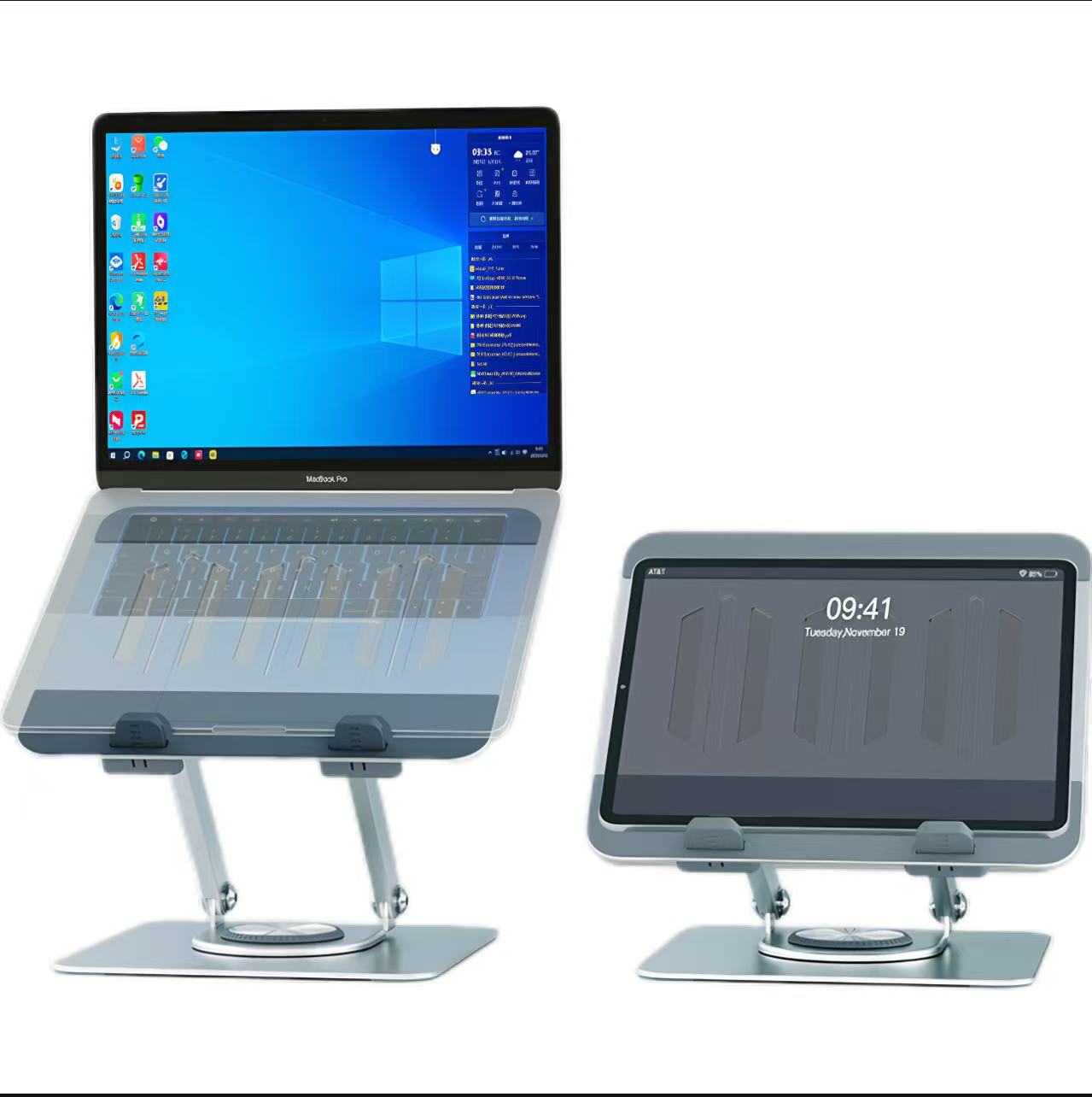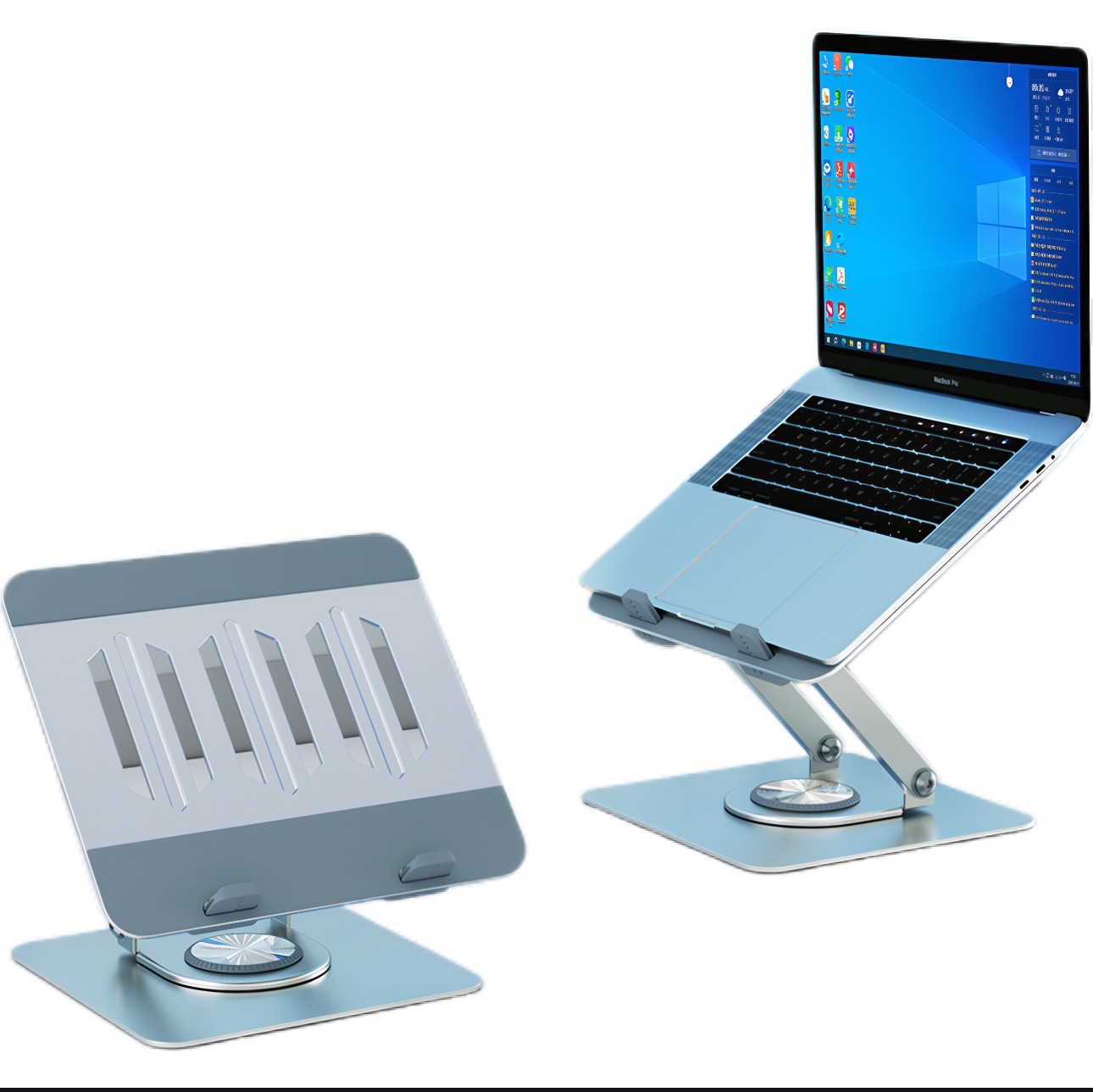 Portable laptop stand for office use This computer stand has an upgraded footrest that allows you to adjust it to stabilize your device. The back cooling grid and the large area of silicone design provide excellent protection for the appearance of your device. Made from aluminum alloy, it boasts high strength, light weight, and a very compact design, allowing for rotation at different angles. Customization is available based on different materials, weights, and types.