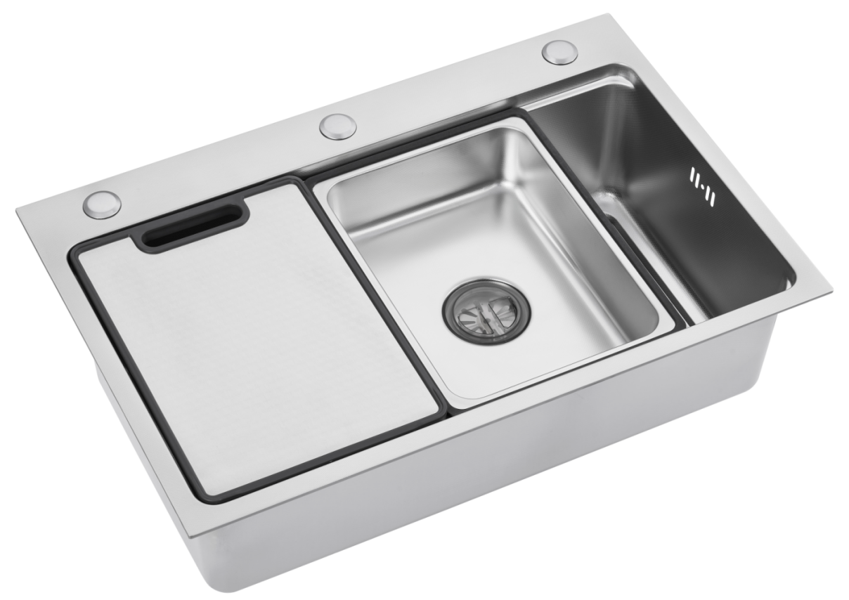 Spacious Single Bowl Sink with Standard Accessories Description of goods: Model: AM-7545TD Type: single press sink top mount Bowl : single bowl Application: Kitchen ,bar, Drainer: 110/114mm Accessories Option: Colander , Grid ,basin,basket,wood cutting,cup washer, soap dispenser Specification: Material: Stainless Steel 304 Finish: Satin/NANO PVD Dimension:750*450*210 Thickness: 3.8+0.6 Bottom Finish: Sound padding and under coating Packing: Carton Box/Pallet package The multifunctional top mount sink 7545TD, compared to traditional single-function sinks, features a more user-friendly design with integrated practical functions, aiming to provide users with a more convenient and efficient kitchen experience. Below are some of the main benefits of the multifunctional sink: **High Space Utilization Efficiency**: For families with limited kitchen space, a multifunctional sink can effectively save room. It integrates the functions of various kitc…