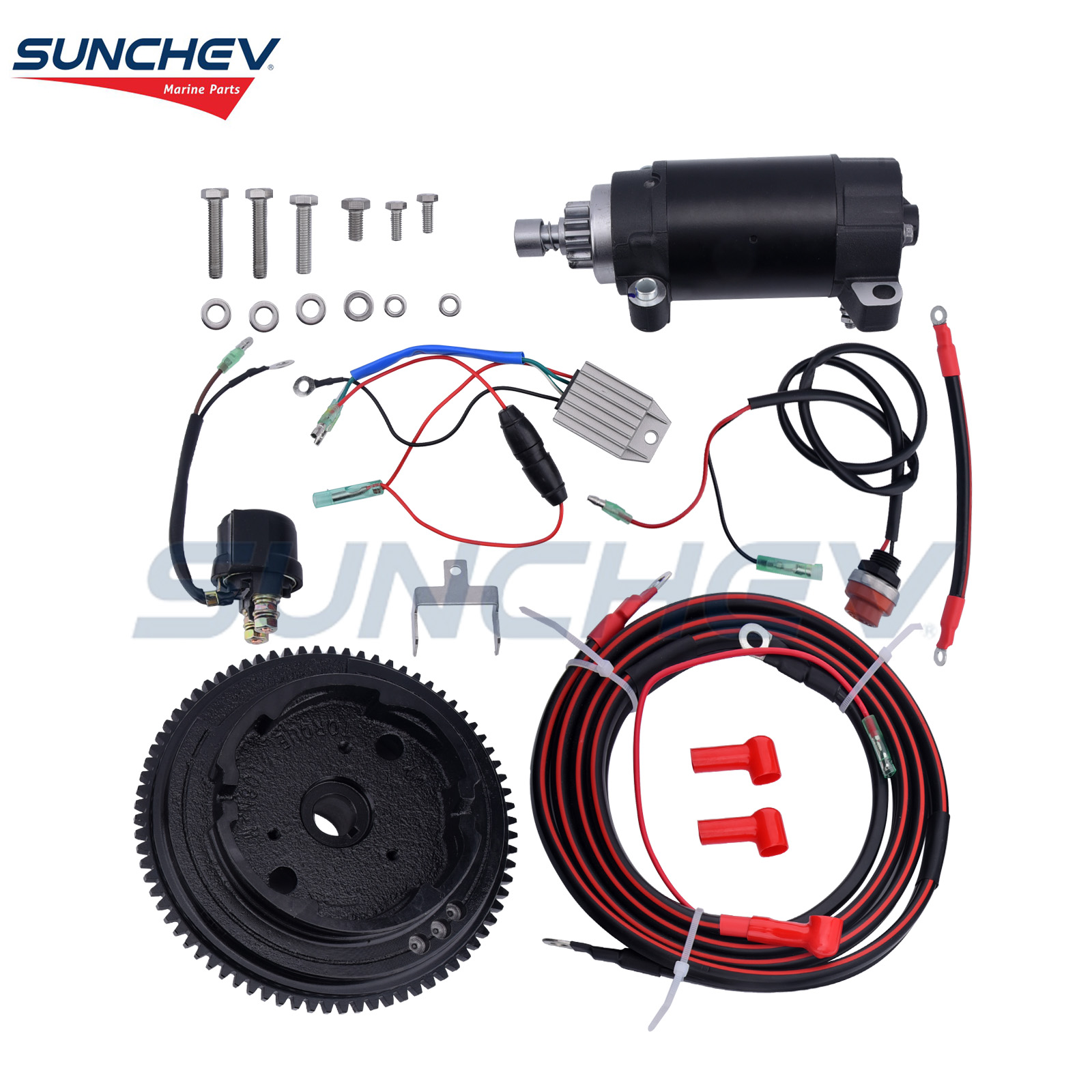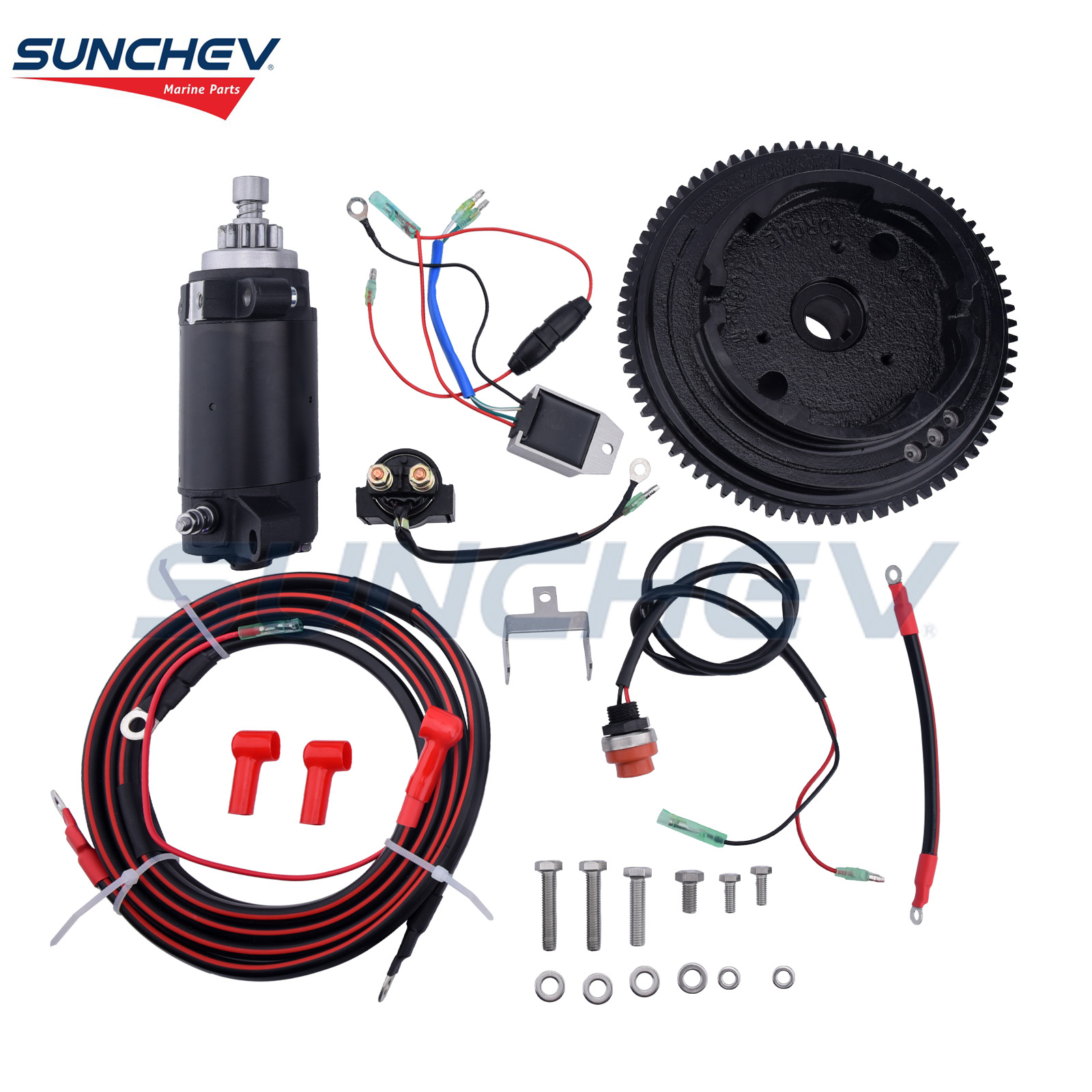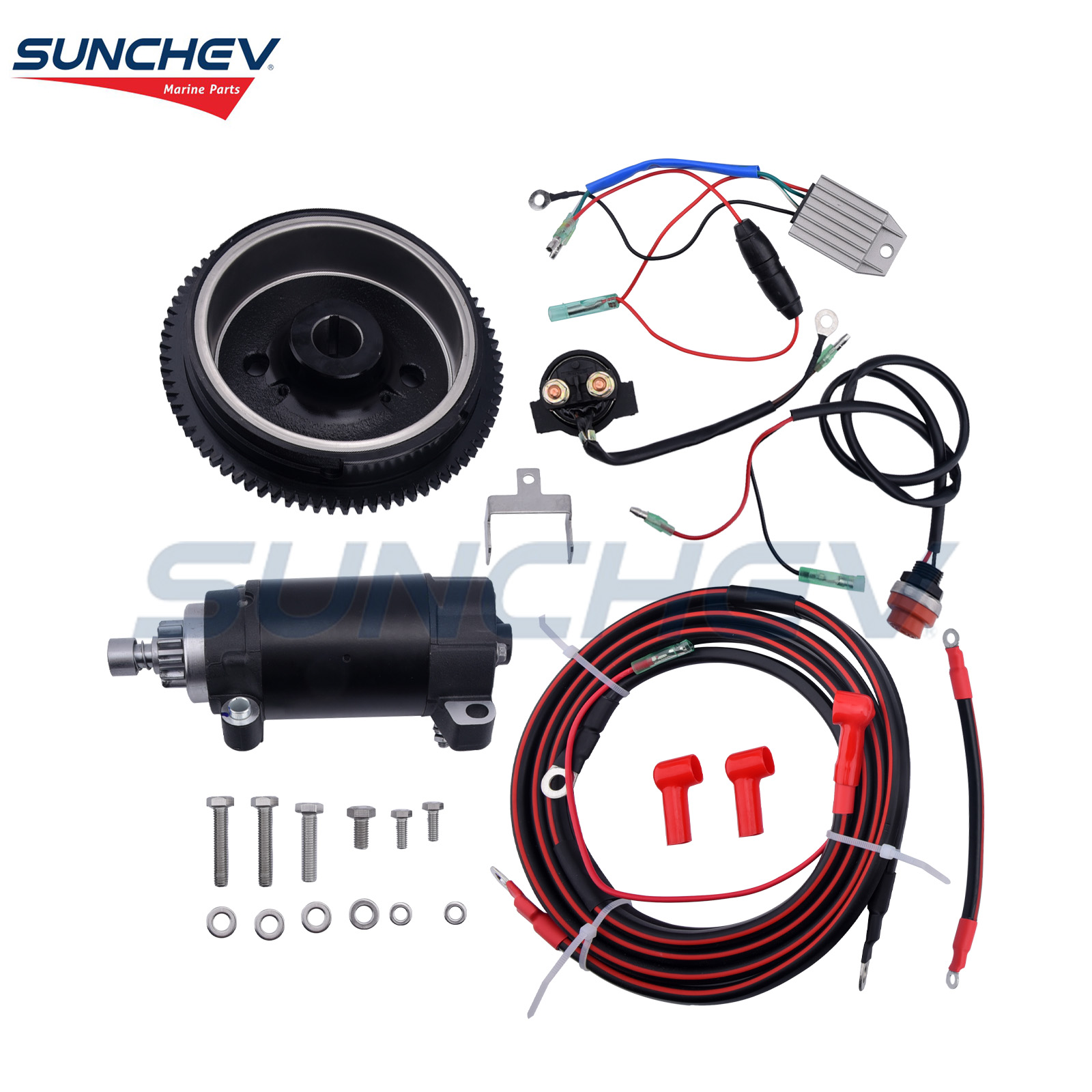 SUNCHEV Electric Starter Kit 6AH For Yamaha 20hp(4 Stroke) Outboard Motor Boat Engine This product is a complete electric start retrofit kit designed specifically for certain models of Yamaha 4-stroke 20 horsepower outboard engines. Its core function is to transform a manually started (rope start) engine into an electrically started engine, greatly improving the convenience and comfort of use. Part Number:6AH Horsepower: 20 HP (horsepower) Stroke type: 4-stroke The Yamaha 20 horsepower four stroke outboard motor special electric starter kit (including 6AH battery) is an upgraded solution that provides users with great convenience. It modernized the original rope start method, enhancing the overall grade and user experience of the vessel. Adequate Reserves Our warehouse loaistics is a system that combines management, planning and organization. Thisincludes managing space, planning shipments, and organizing information so the warehouseoperates…