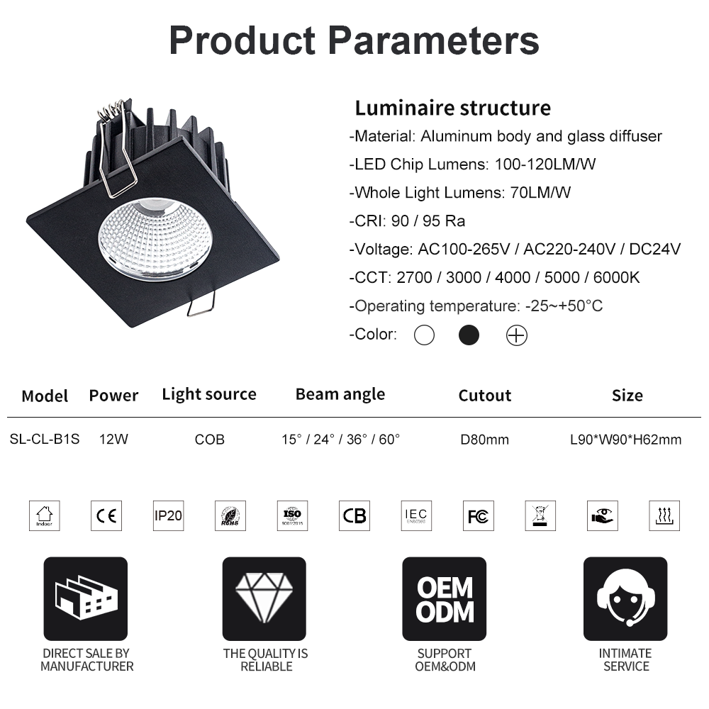 Waterproof Recessed Square LED Downlight with IP65 Rate Description The Waterproof IP65 LED Down Light is an architectural-grade luminaire engineered to deliver efficient, balanced illumination for interior environments. Designed with a compact square housing, it integrates seamlessly into any ceiling, providing high-quality light with minimal visual intrusion. 1. Product Overview This recessed LED downlight is designed for ambient and accent lighting across residential, retail, and commercial projects. Its square frame and recessed profile create a professional and contemporary look suitable for all ceiling types. 2. Lighting Technology Powered by advanced COB LED modules, the fixture provides superior lumen output and consistent color temperature. Available in 2700K to 5000K, it delivers warm to neutral tones suitable for different interior moods. The high CRI (>90) ensures true color reproduction — essential for retail displays, art installations, and premium living spaces.…