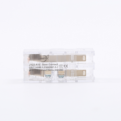 Name: Door Contact Switch Model: JY03-A1Z Application: Elevator door system Function: Electrical verification of door position and door lock status The door contact switch is divided into two parts: the switch part and the contact seat part. The switch housing is white and transparent, with a baffle on the upper shell. It is equipped with a spring sheet, cylindrical silver alloy contact, terminal block, and installation bolt. The contact seat housing is black and is equipped with a silver alloy composite sheet. Both parts of the housing are V0 flame retardant. This switch is laser printed with labels. The length of the installation bolt for the switch part can be customized, and there are two sizes of cylindrical contact points.